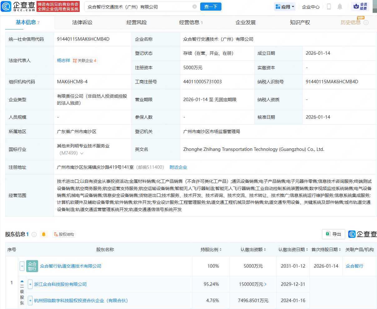 近日,众合智行交通技术(广州)有限公司成立,法定代表人为杨志祥,注册资本为5000万元,经营范围包含:航空商务服务;航空运营支持服务;智能无人飞行器制造;城市轨道交通设备制造等。企查查股权穿透显示,该公司由众合科技(000925)旗下众合智行轨道交通技术有限公司全资持股。