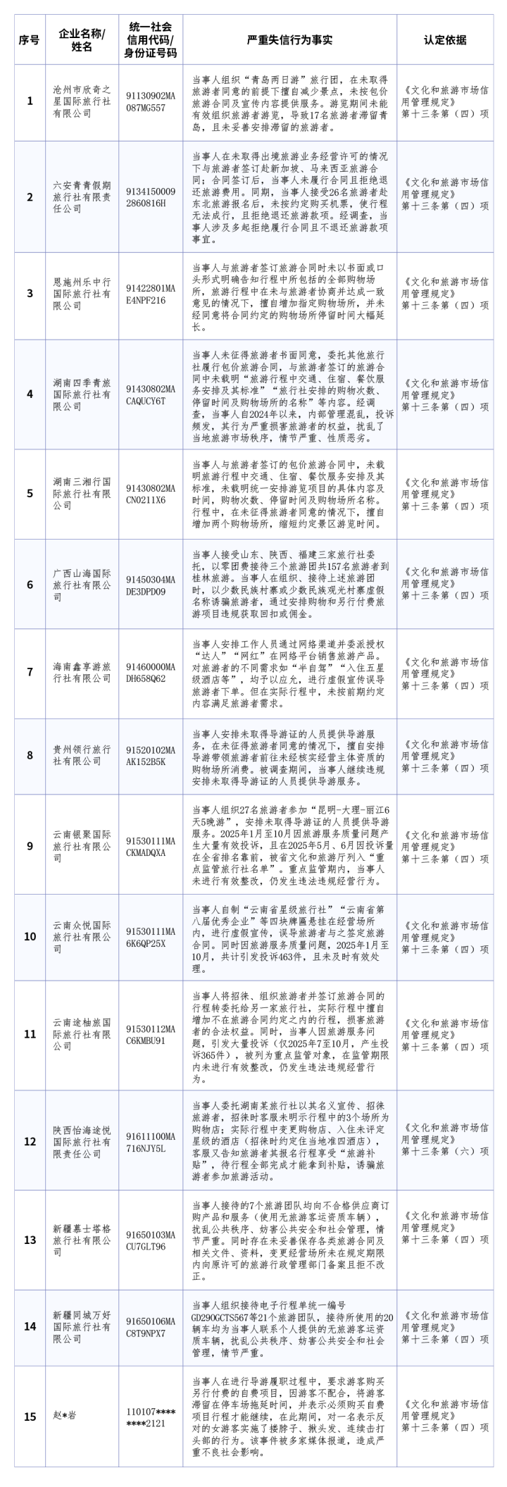 旅游市场秩序集中整治工作开展以来,各地依法查办了一批重大案件,并依法依规开展失信主体认定,截至2026年3月底,全国文化和旅游市场共认定失信主体1655个。为落实《国务院办公厅关于进一步加强旅游市场综合监管的通知》有关要求,提升信用监管效能,营造诚信、公平、有序的旅游市场环境,现对旅游市场秩序集中整治严重失信主体典型名单(2026年第一批)予以公布。